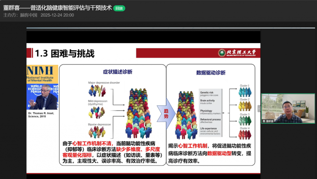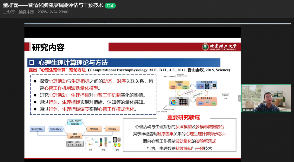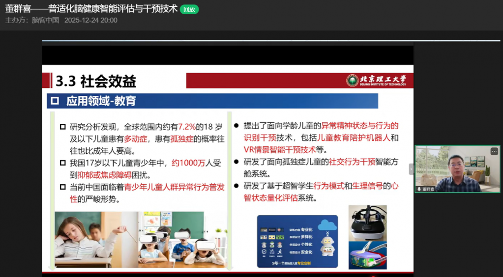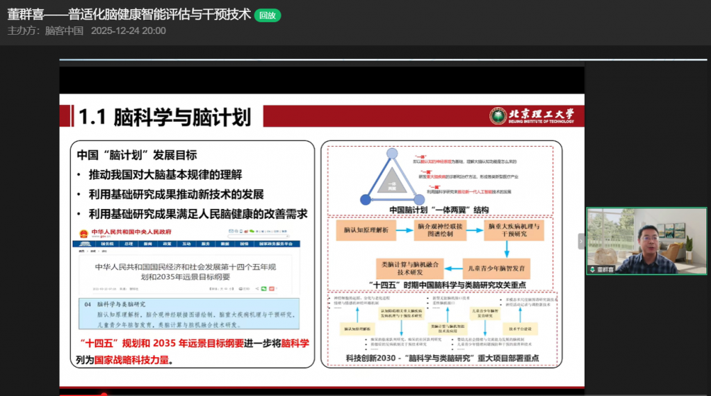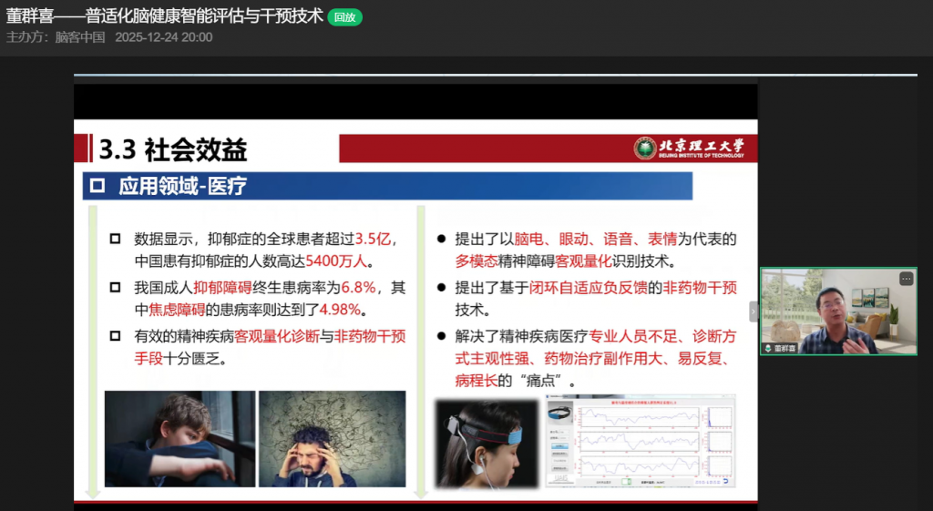 12月24日,在脑客中国直播间,北京理工大学董群喜教授带来以“普适化脑健康智能评估与干预技术”为主题的精彩分享,从背景简介、研究内容到产业落地,全方位拆解脑健康领域的创新突破与应用实践,为观众呈现了一场兼具学术深度与产业价值的知识盛宴。